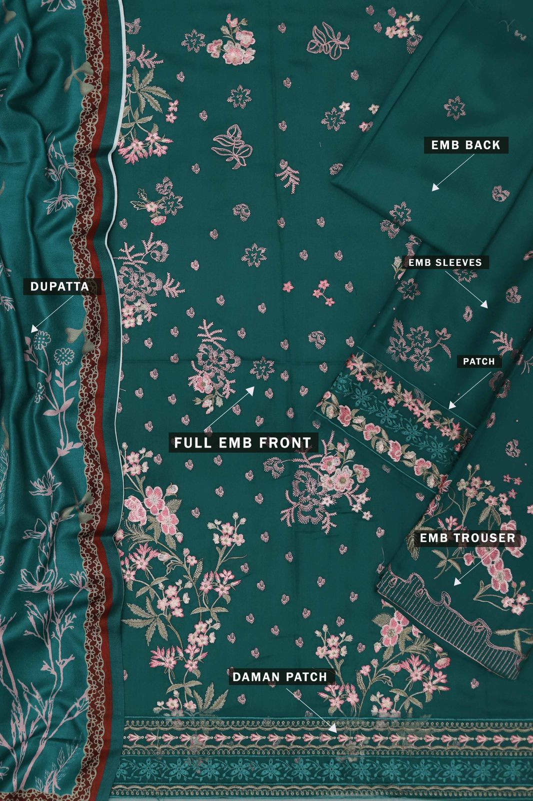 Dhanak Marina 3-Piece Embroidered Suit – Teal Green | Wool Shawl | Daman & Sleeves Patches