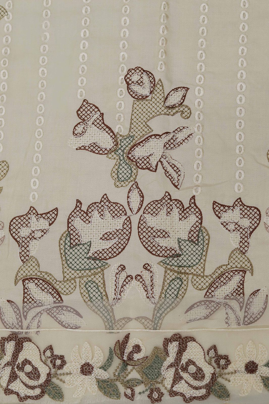 An elegant soft-cream beige Dhanak 3-piece suit featuring refined embroidery 🧵 with delicate thread work and lace detailing 🌸. Perfect for timeless sophistication and graceful wear.